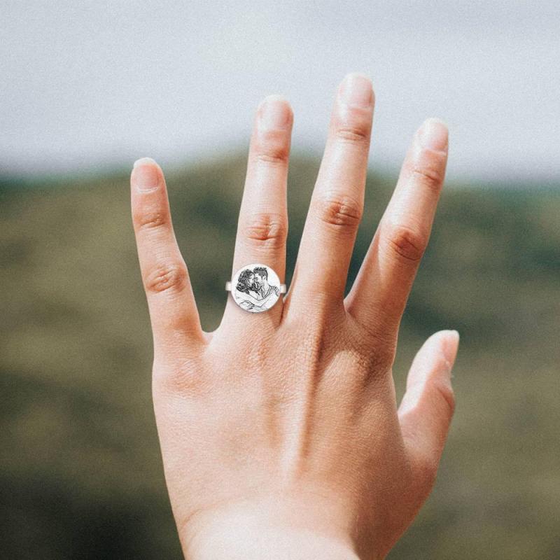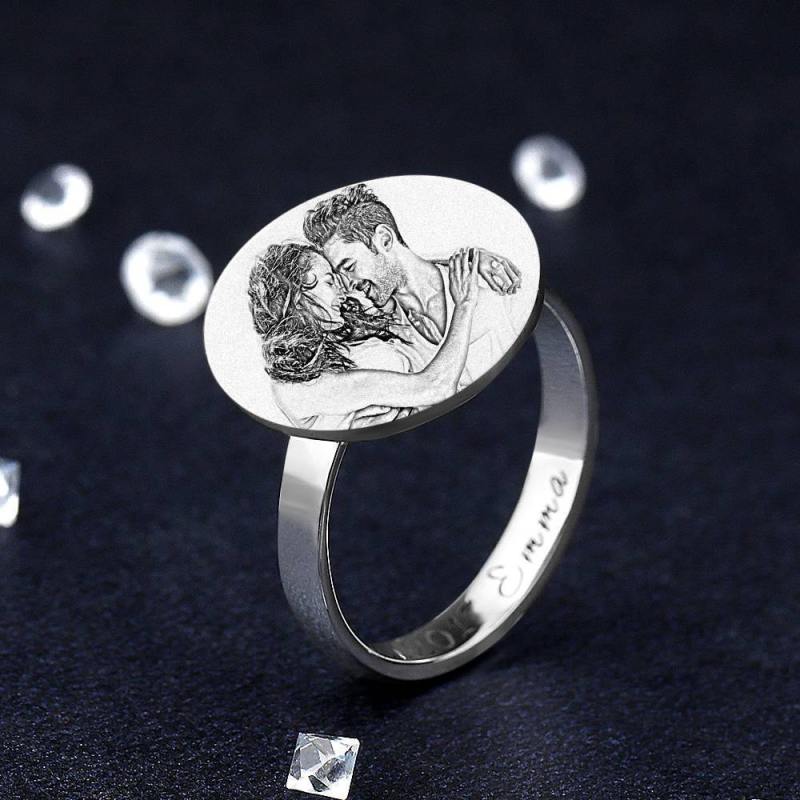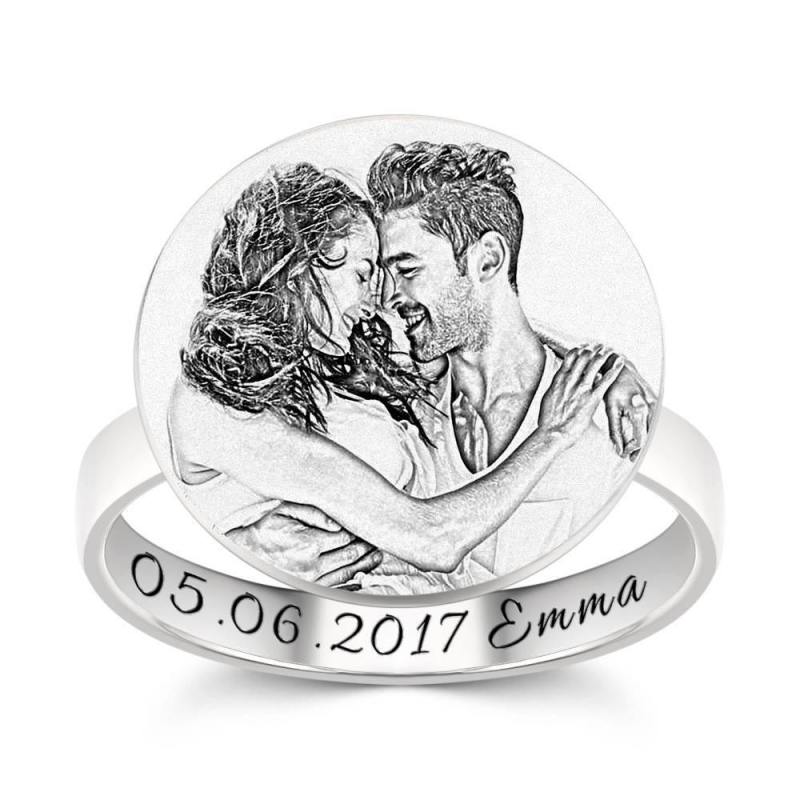 Photo Ring with Engraving Platinum Plated Silver Round-shaped, Girlfriend Gift