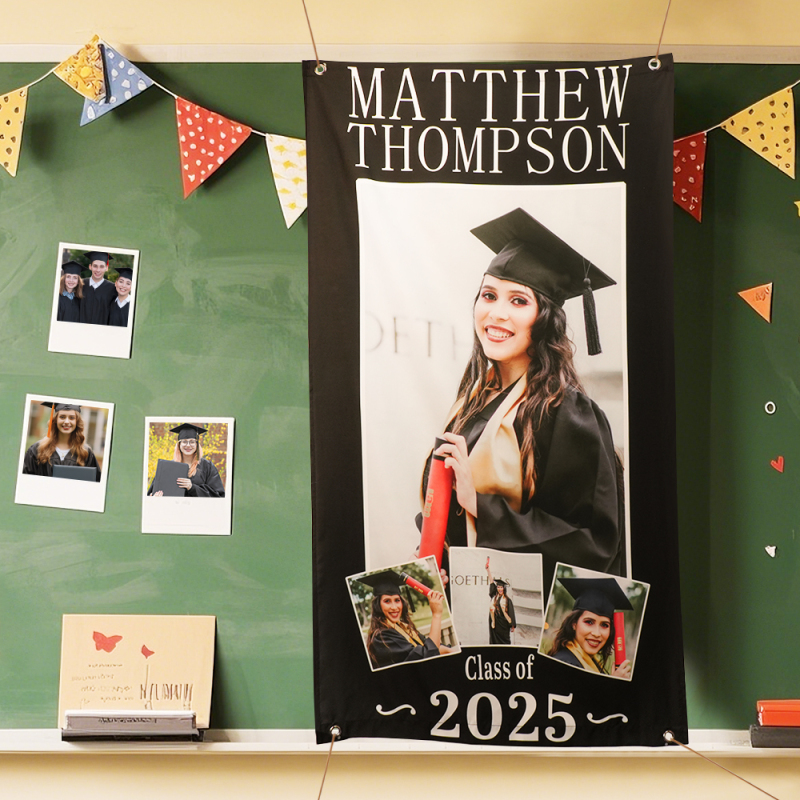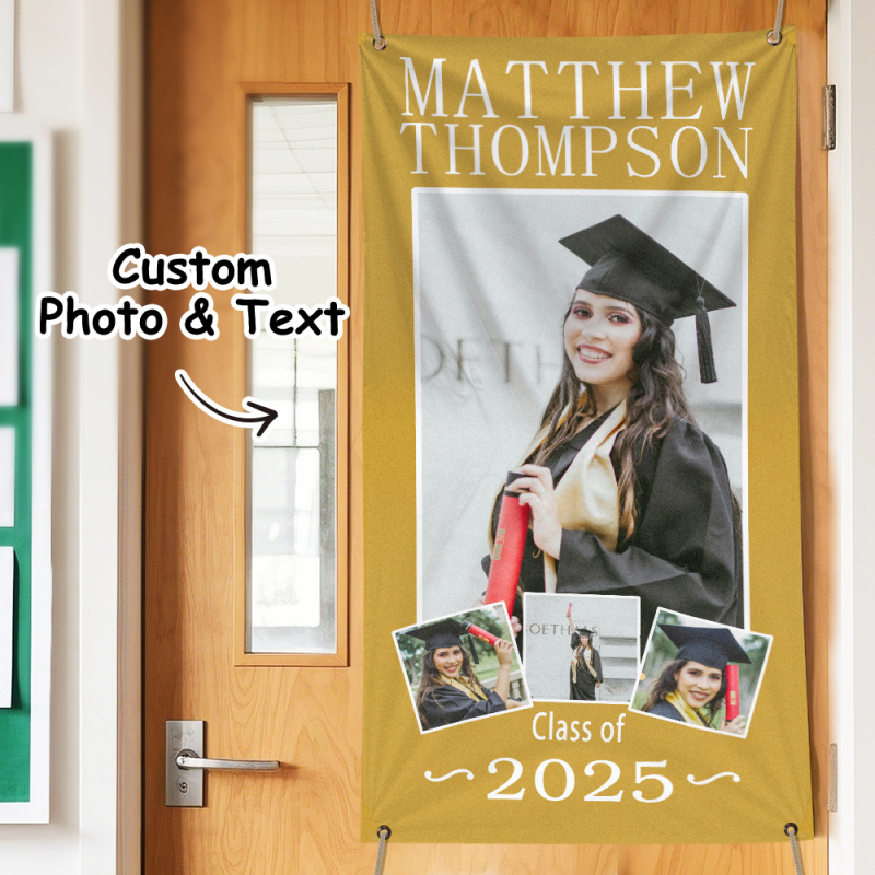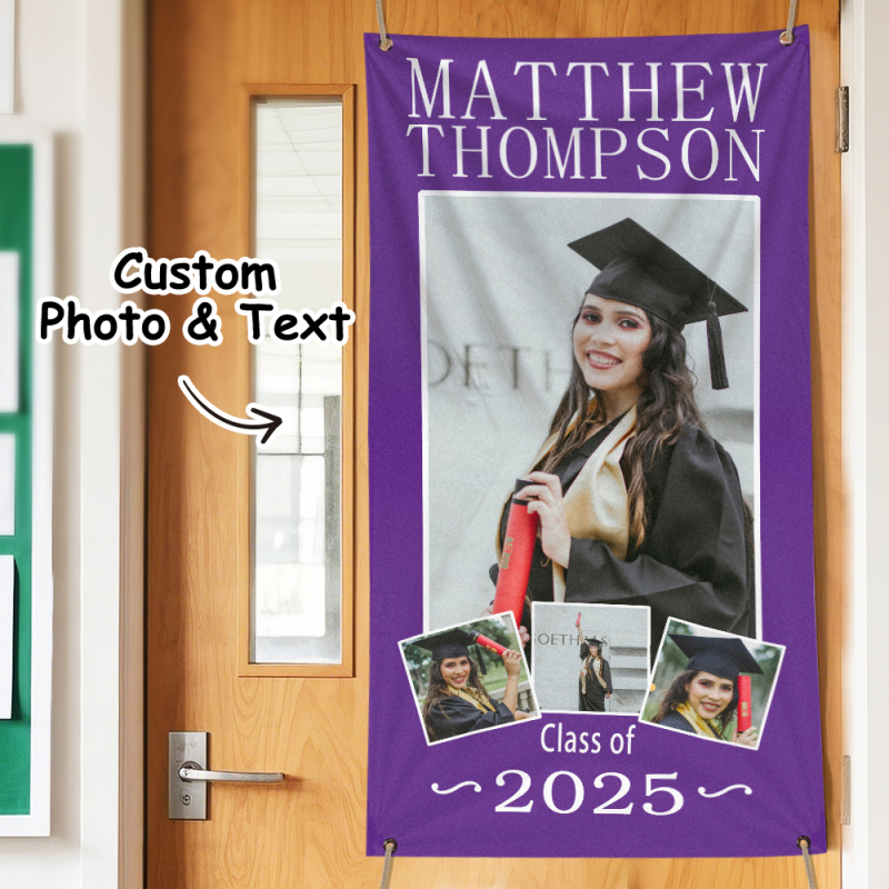 Celebrate your special achievement with our customizable Graduation Photo Banner. Made to showcase your proudest moment, this "Picture of Success" banner serves as a memorable home decor or graduation gift. Personalize it with your own photo and message to create a unique keepsake that honors your journey and success.