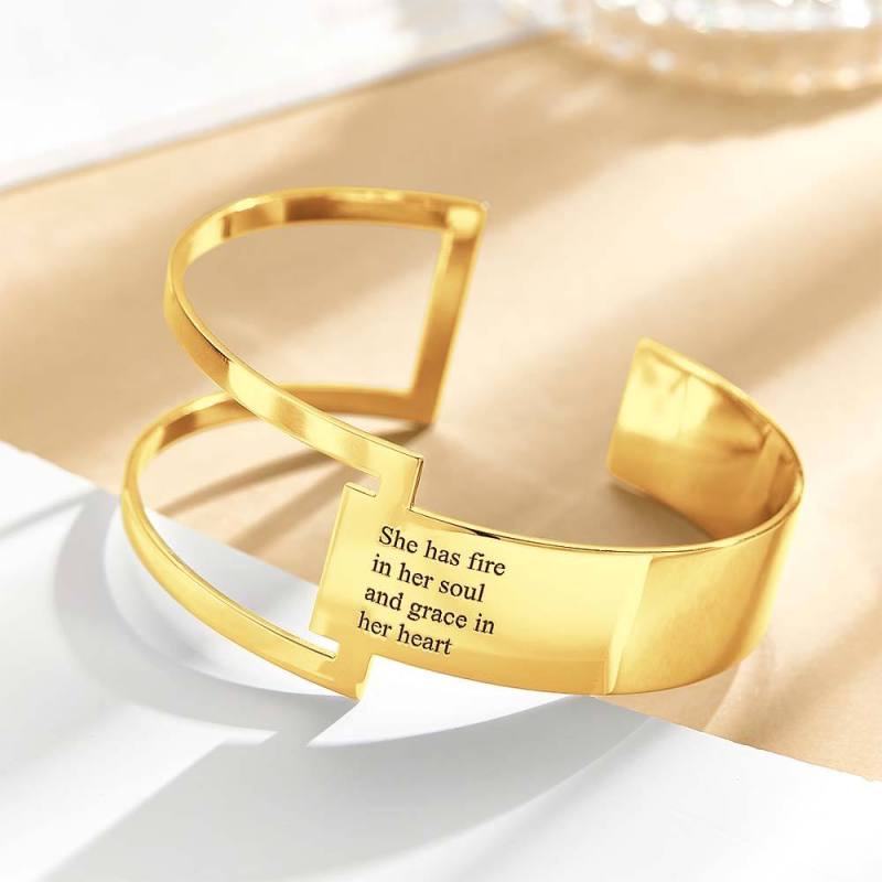 The unique qualities of this geometric cuff bracelet put a modern twist on a truly inspirational phrase. Let your inner fires blaze and shine with the confidence that you get from showing off your own personal style. This cuff has an open design that easily fits most wrist sizes. The design features small text, perfect for personal moments of reflection.