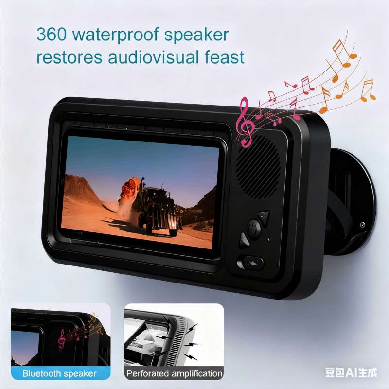 Featuring a built-in high-quality Bluetooth speaker, you can stream crisp, clear sound directly from your phone for an immersive entertainment experience. The 360° adjustable wall mount ensures the perfect viewing angle, while the secure seal protects your device from water and steam.