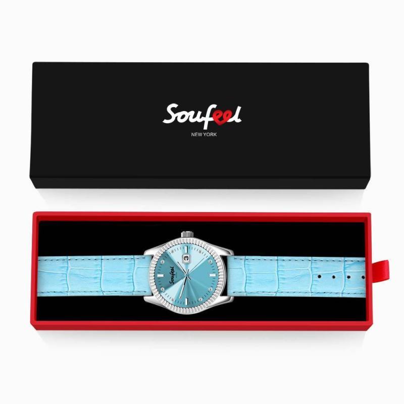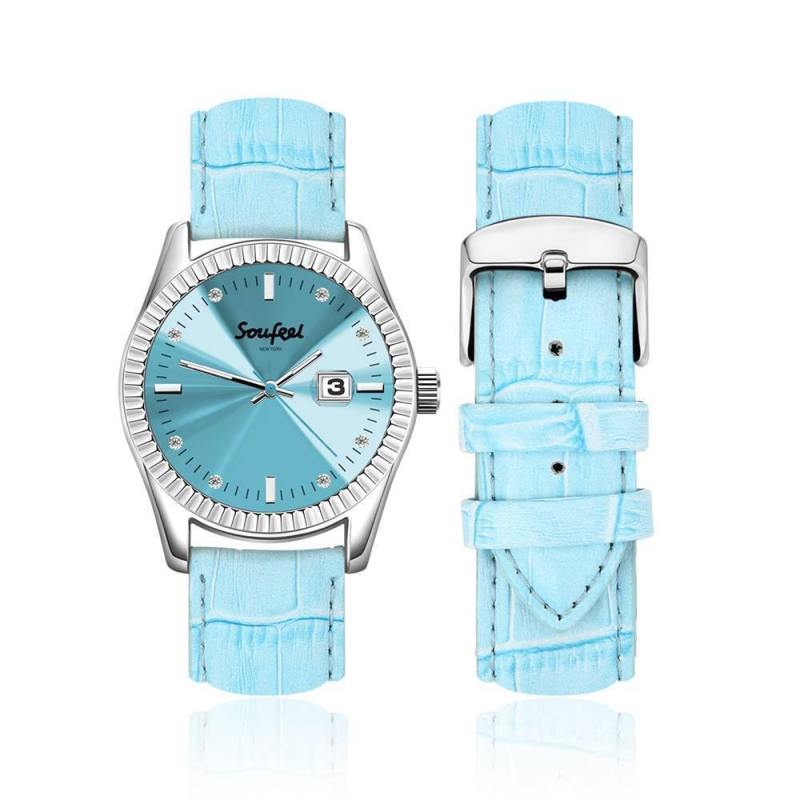 Soufeel Women's Crystal Crystal Watch Light Blue Leather Strap 38.5mm