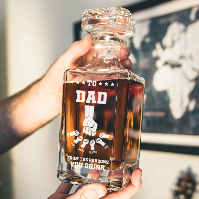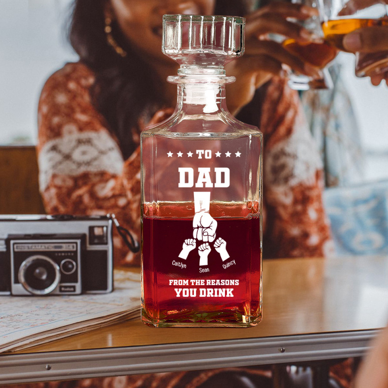 Give Dad a gift as bold and unforgettable as his sense of humor with this personalized whiskey bottle. Featuring the playful phrase To Dad, from the reasons you drink' and personalized with the kids' names, this keepsake bottle is both thoughtful and fun.